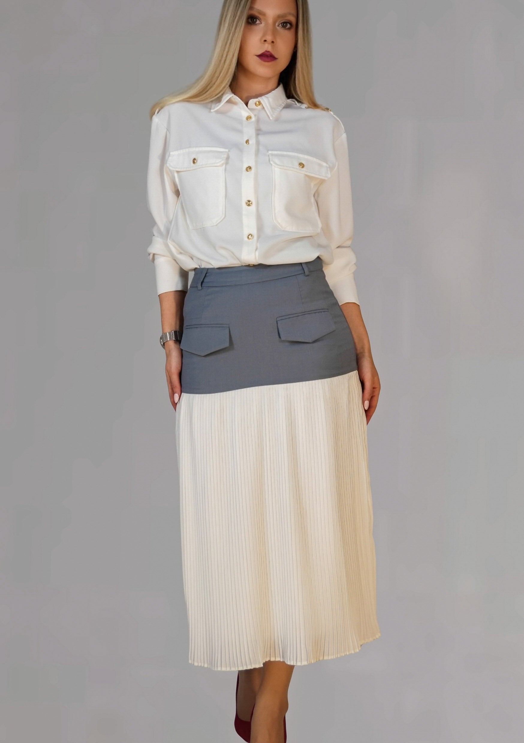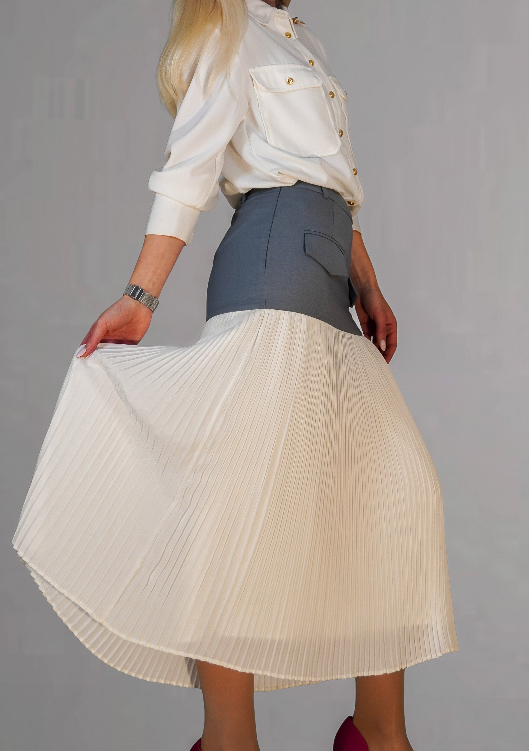 La parte superior se ajusta elegantemente a las caderas, creando una silueta limpia y ceñida con prácticos bolsillos delanteros con solapa y trabillas para el cinturón que permiten diferentes estilos. La parte inferior se transforma en un tejido ligero con delicados pliegues que fluye con fluidez en cada movimiento.