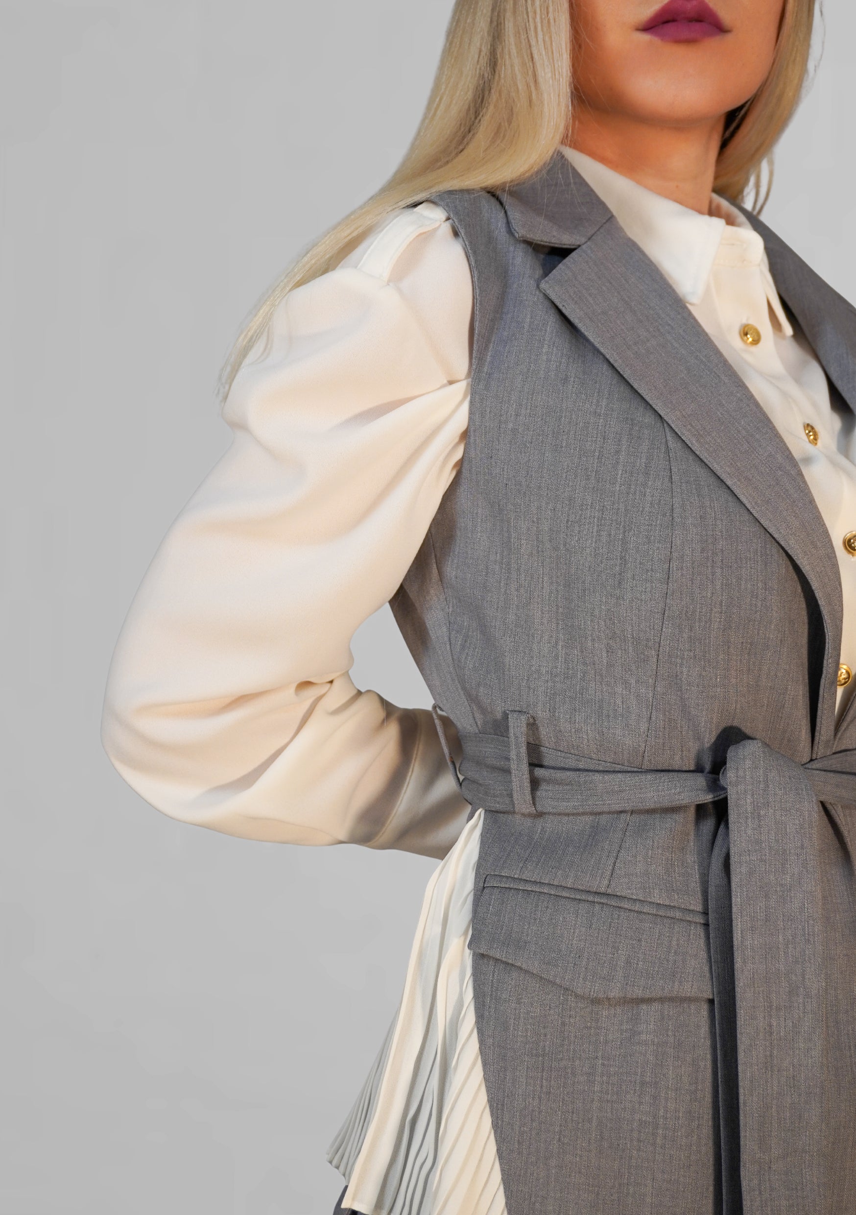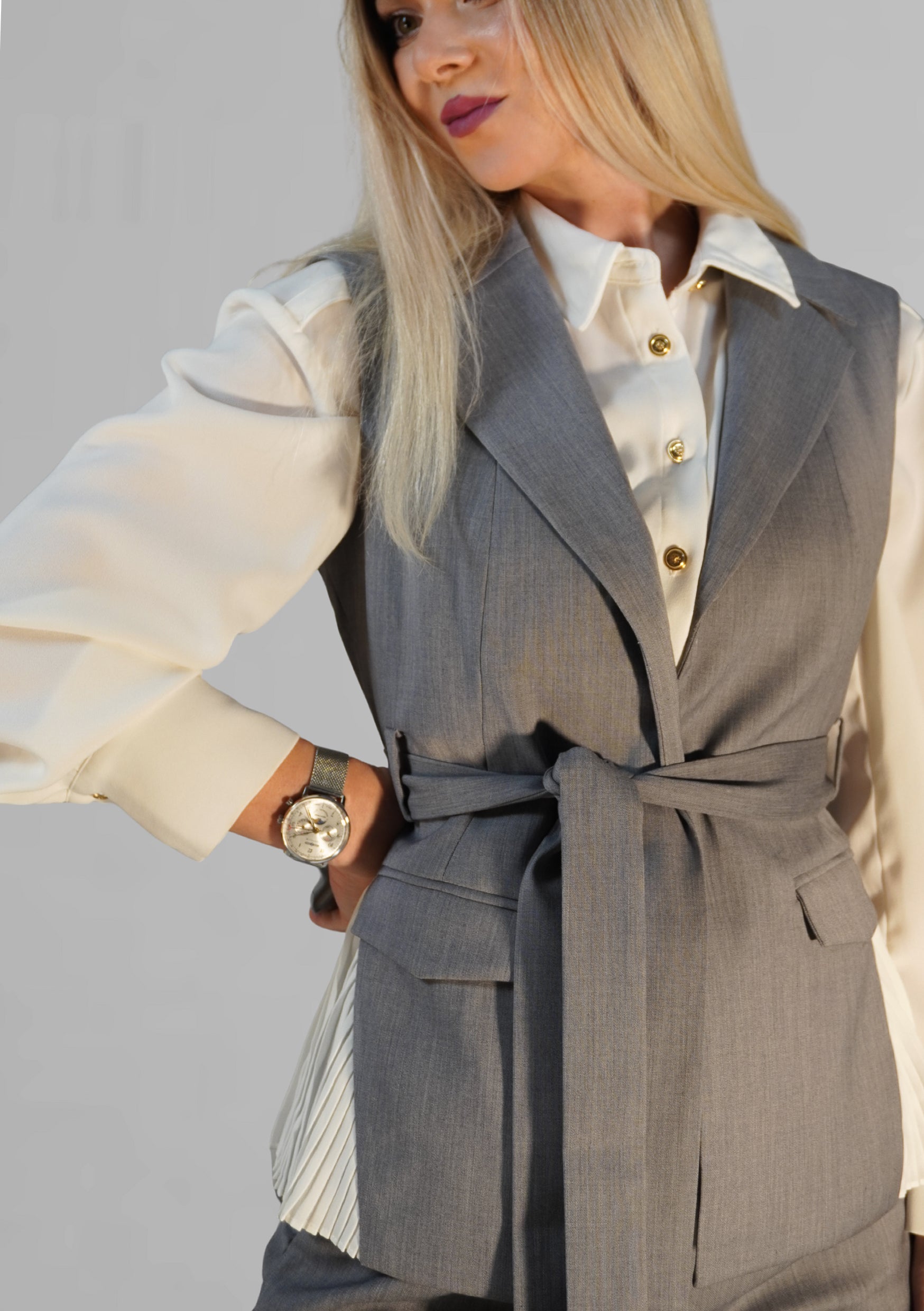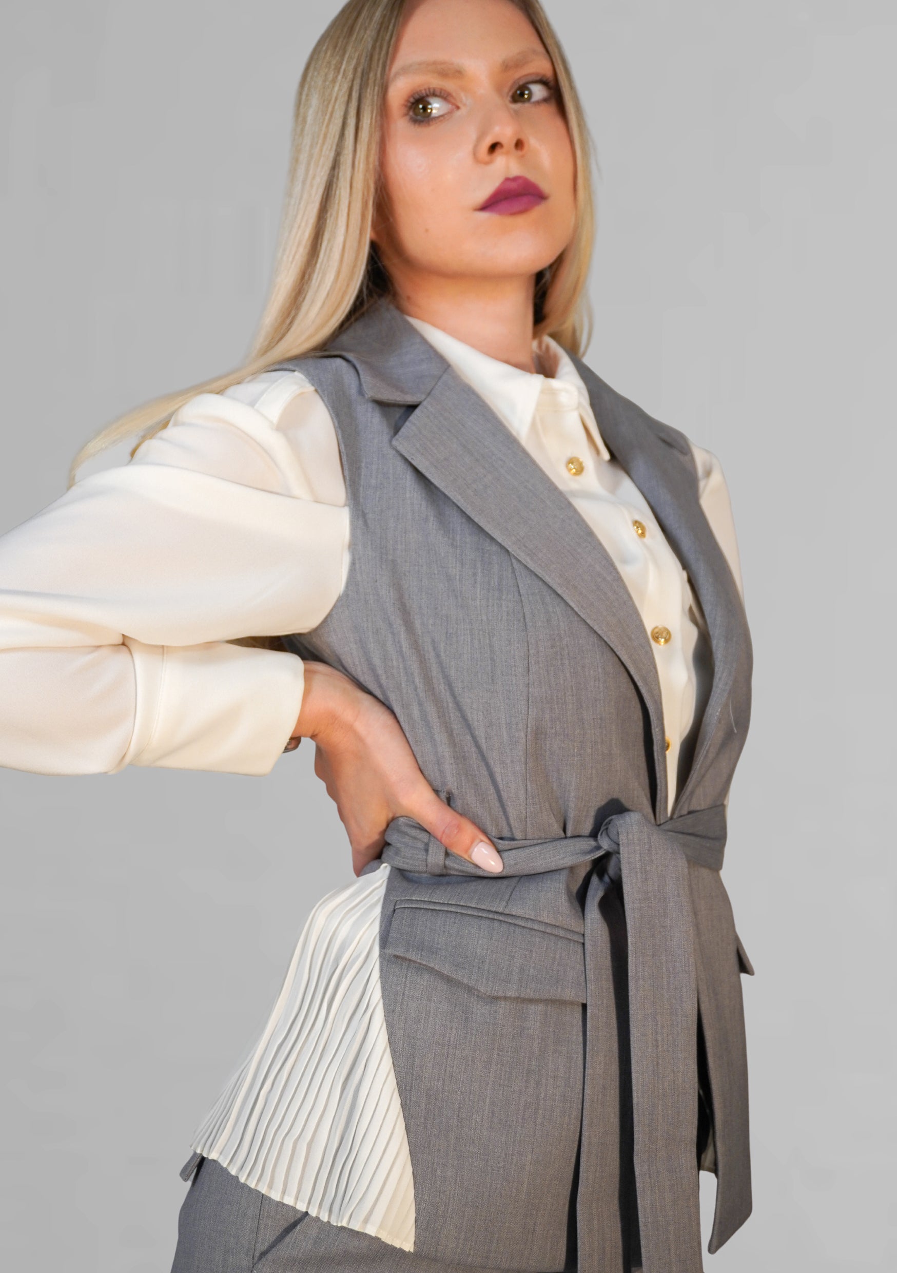 This sleeveless blazer vest blends clean tailoring with a fluid silhouette, highlighting the feminine form without sacrificing ease.